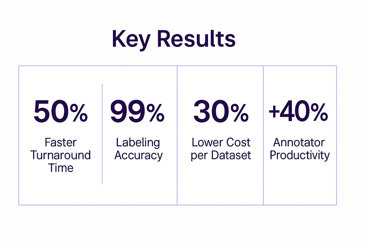 50% faster turnaround: Automated annotation and validation reduced review cycles from one week to 2-3 days.