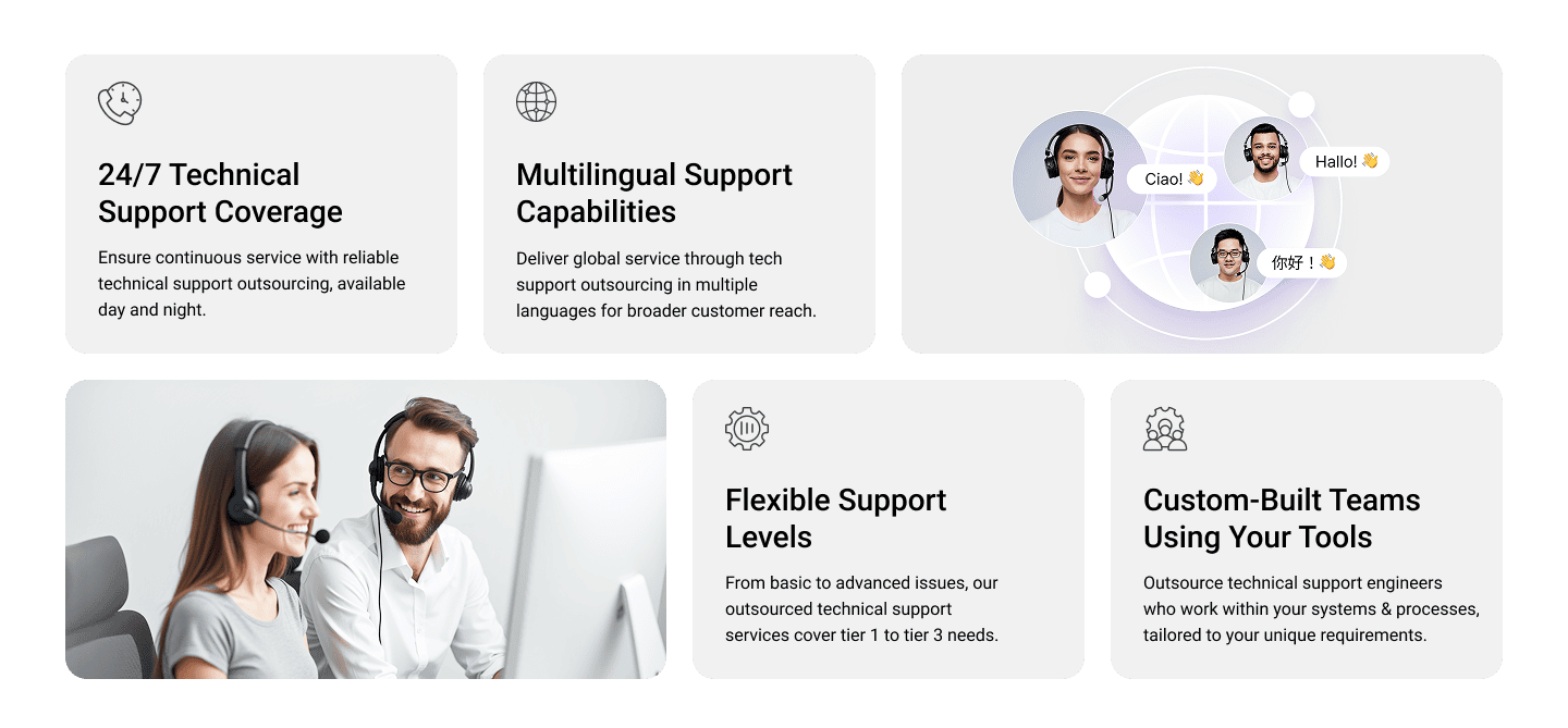 Outsourcing technical support reduces costs, provides 24/7 coverage, and gives access to trained experts without long recruitment cycles. Unlike hiring individual engineers, outsourced technical support services scale quickly and adapt to your business needs.